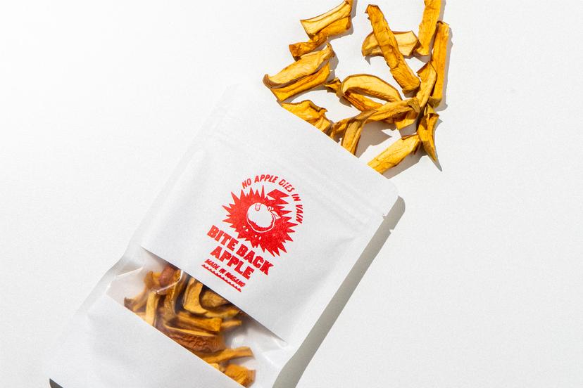 BITE BACK APPLE SNAPSは、規格外りんごに再び光を当てた、反撃のドライアップル。 長野県産の「葉取らずりんご*」をそのままスライスし、しっかり乾燥。 砂糖も香料も加えず、りんご本来の甘みと酸味、そしてザクッとした食感をそのまま封じ込めました。 *収穫まで葉を摘まないで育てたりんごです。葉をつけたままにすることで、光合成によって作られた栄養分と甘味が最大限に果実に供給されるため、非常に甘くジューシーな味わいになるのが特徴