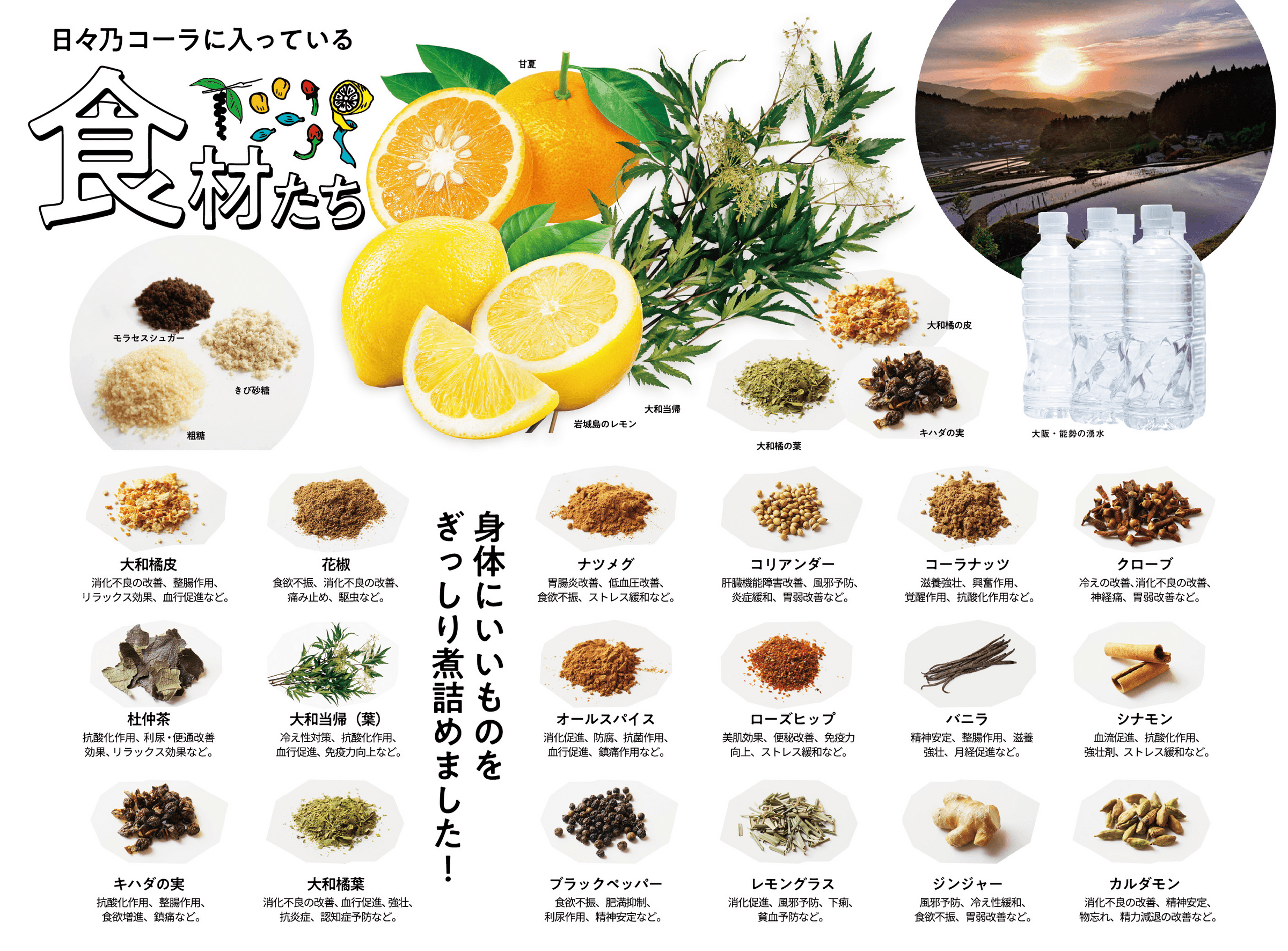 瀬戸内レモンから特殊な加工でオイルを抽出、漂う爽やかな香り 瀬戸内海の離島・愛媛県岩城島(いわぎじま)から届くフレッシュなレモン、奈良県生駒市のコーラの生産工場で特別な方法でレモンオイルとレモン水、皮、果肉に分けてタイミングを分けて鍋に投入しています。 煮出した鍋の火を止めた後、搾りたてのレモンオイルを振り入れることで工場全体にレモンフレグランスが充満します。飲むたびに搾りたてのようなレモンの香りを感じるのはそんなこだわりの上に成り立っています。